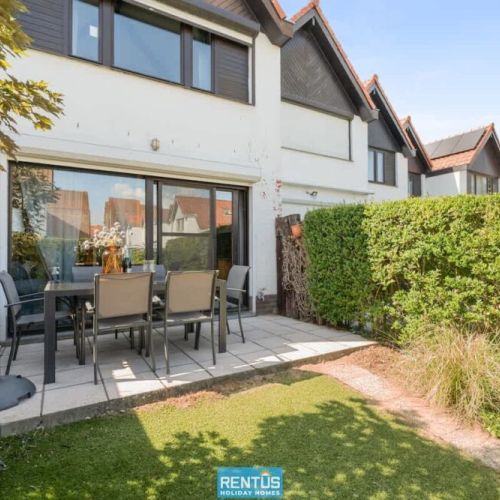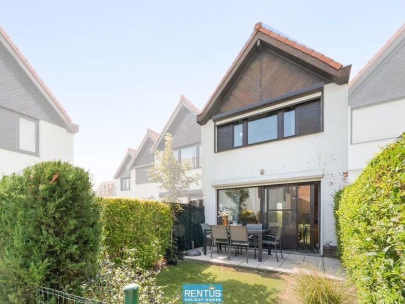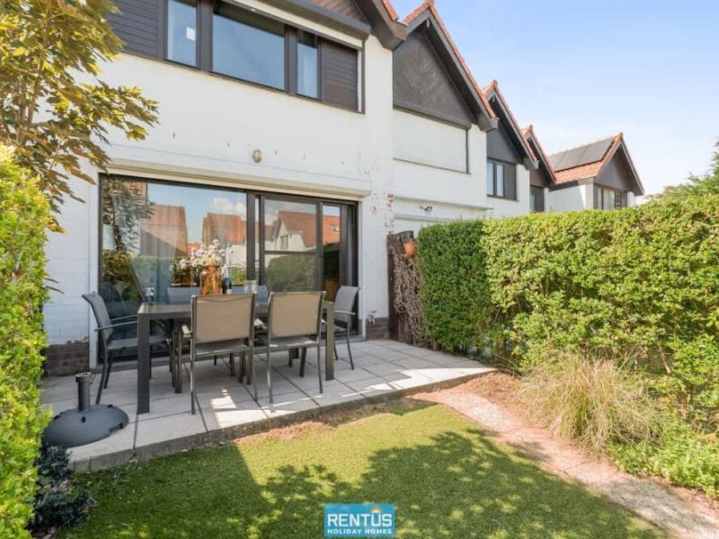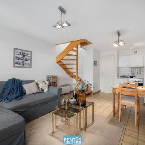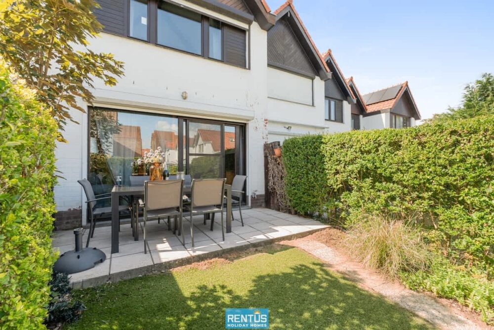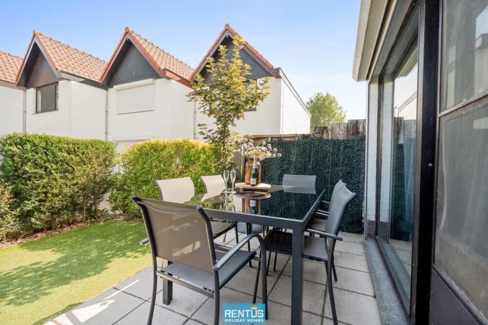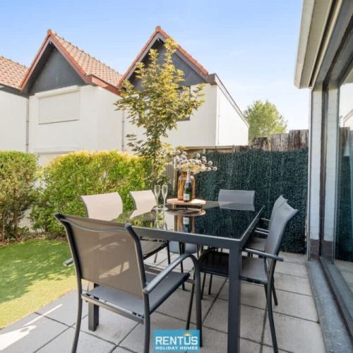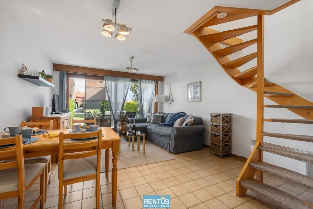The house features an open and compact living space with a cosy lounge and fully equipped kitchen – everything you need for a comfortable stay. From the living room, there is direct access to the enclosed sun-facing garden with garden furniture: perfect for relaxing or enjoying meals outdoors.