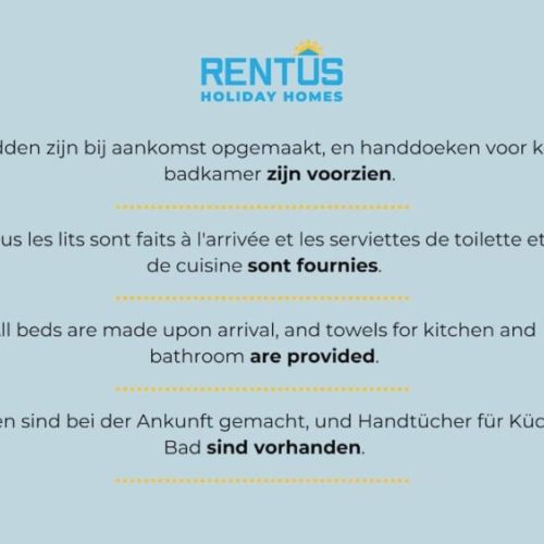 Rentus is the property agent who operates in the name and on behalf of the owner. The accommodation is furnished and equipped with kitchen and sanitary facilities. Cooking utensils and dishes are provided for the number of people allowed in the accommodation. The total price includes the rental of the accommodation (of which 90% refers to the property and 10% to the furniture), the cleaning fee and any administration costs.