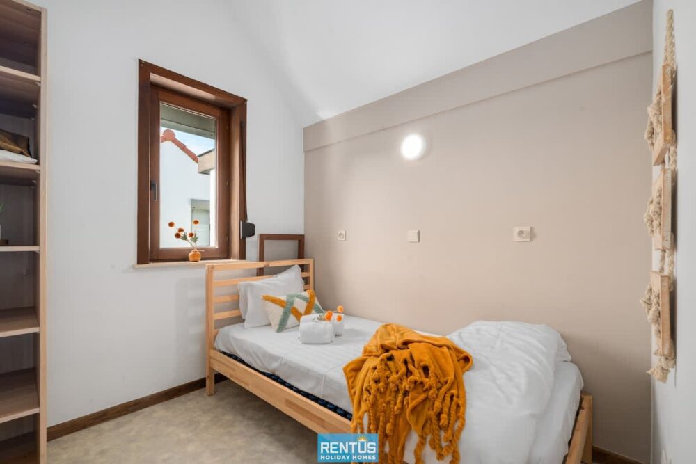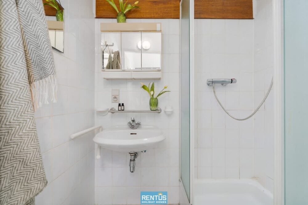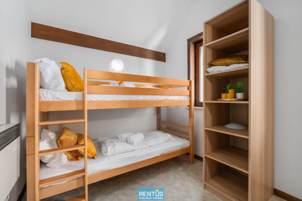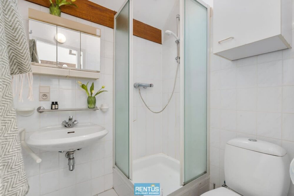 Upstairs there are two bedrooms: one with a double bed, and one family-friendly room with a bunk bed and an additional single bed. There is also a separate bathroom with shower, sink, and toilet. Beds are made upon arrival, and towels are provided.