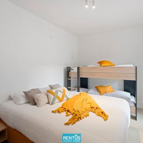 Kariss II features two comfortable bedrooms. The spacious double bedroom has a double bed, while the second bedroom is ideal for families, with a double bed and a bunk bed as well as direct access to a separate terrace. The beds are already made for you upon arrival and towels are also available during your stay.