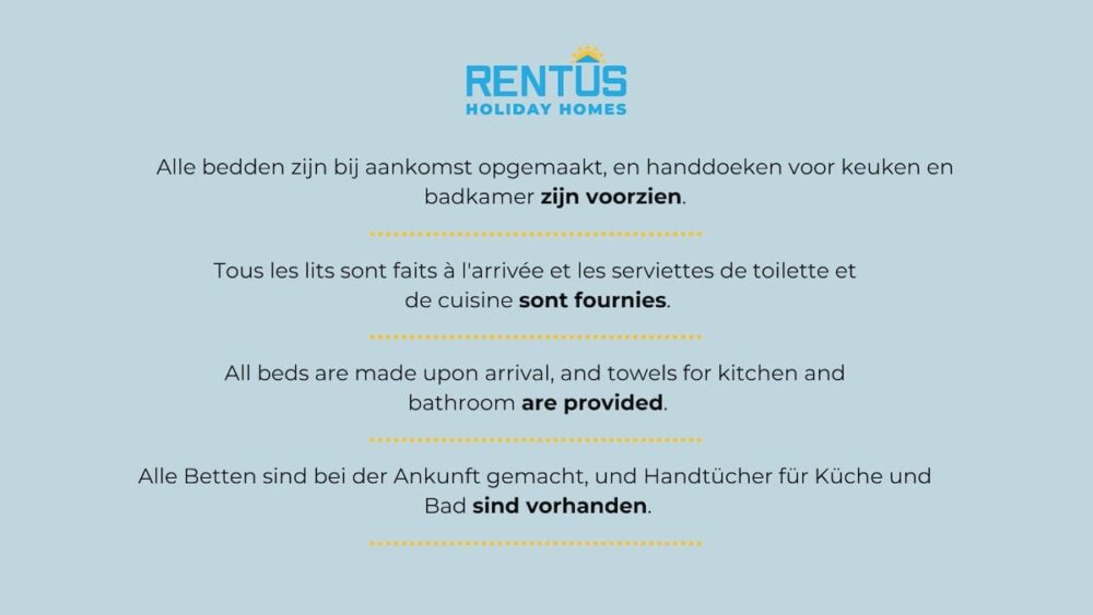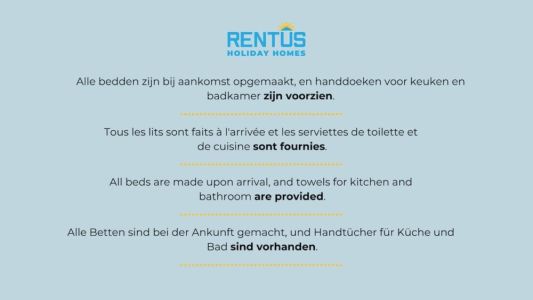Rentus is the property agent who operates in the name and on behalf of the owner. The accommodation is furnished and equipped with kitchen and sanitary facilities. Cooking utensils and dishes are provided for the number of people allowed in the accommodation. The total price includes the rental of the accommodation (of which 90% refers to the property and 10% to the furniture), the cleaning fee and any administration costs.